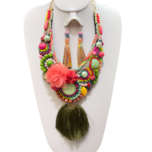 Detalles : Materiales: chaquirón, cristal, perlas sintéticas, flor de chifón, madera y motas de hilo Medidas: 15 cm aprox. Incluye collar y aretes.