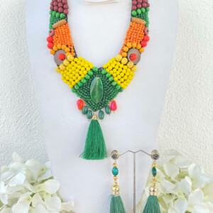 Detalles : Materiales: chaquirón, motas de hilo, piedra naturales, madera, tela, pasta. Incluye collar y aretes.