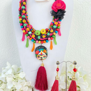 Detalles : Materiales: chaquirón, cristal, flor de chifón, motas de hilo, madera, catrina de porcelana, tela. Incluye collar y aretes.