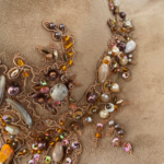 Materiales: chaquirón, perla sintética, cristal, piedra acrílico, piedra natural dije metal de estrella de mar, flor de chifón.