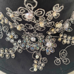 Materiales: chaquirón, perla sintética, flor de caucho, cristal, cadenas de acero inoxidable, motas de hilo, piedra naturales .