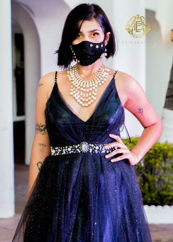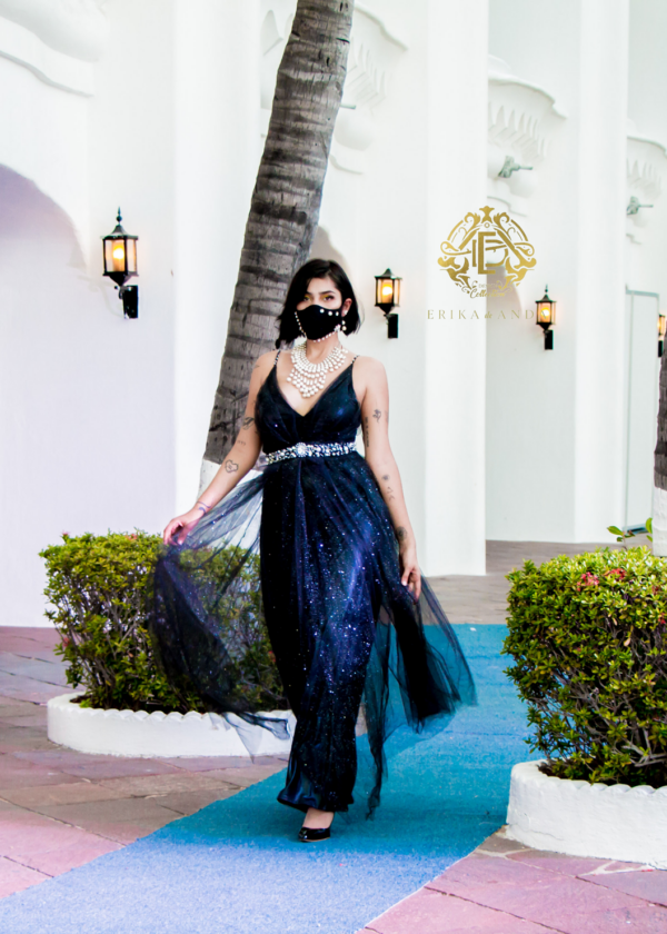 VESTIDO PRINCESA COLOR NEGRO BRILLOSO CON BORDADO EN CINTURA