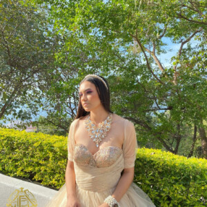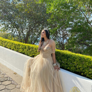 VESTIDO DE PRINCESA COLOR BEIGE CON BRILLOS Y BORDADO EN CINTURA