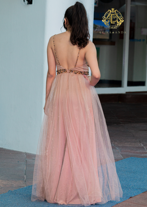 VESTIDO DE PRINCESA COLOR BEIGE CON BRILLOS Y BORDADO EN CINTURA
