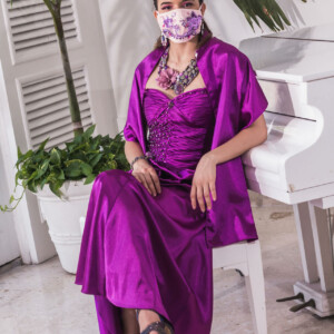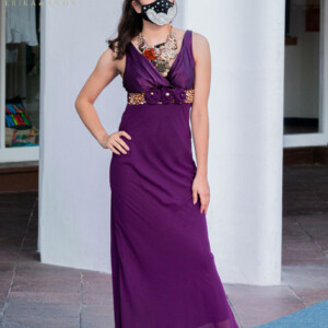 VESTIDO EN V MORADO CON BORDADO EN CINTURA